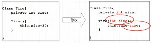 这样,就相当于上面第一个例子,上层建筑依赖下层建筑——每一个类的构造函数都直接调用了底层代码的构造函数。假设我们需要改动一下轮胎(Tire)类,把它的尺寸变成动态的,而不是一直都是30。我们需要这样改: