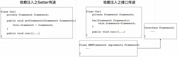 看到没?这里我只需要修改轮胎类就行了,不用修改其他任何上层类。这显然是更容易维护的代码。不仅如此,在实际的工程中,这种设计模式还有利于不同组的协同合作和单元测试:比如开发这四个类的分别是四个不同的组,那么只要定义好了接口,四个不同的组可以同时进行开发而不相互受限制;而对于单元测试,如果我们要写Car类的单元测试,就只需要Mock一下Framework类传入Car就行了,而不用把Framework, Bottom, Tire全部new一遍再来构造Car。这里我们是采用的构造函数传入的方式进行的依赖注入。其实还有另外两种方法:Setter传递和接口传递。这里就不多讲了,核心思路都是一样的,都是为了实现控制反转。