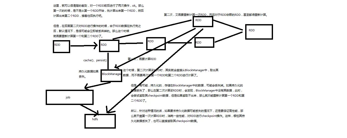 Spark性能优化:对RDD持久化或CheckPoint操作 丰泽 2018-09-14 293 阅读1分钟 对多次使用的RDD进行持久化或Checkpoint 如果程序中,对某一个RDD,基于它进行了多次transformation或者action操作。那么就非常有必要对其进行持久化操作,以避免对一个RDD反复进行计算。 此外,如果要保证在RDD的持久化数据可能丢失的情况下,还要保证高性能,那么可以对RDD进行Checkpoint操作。