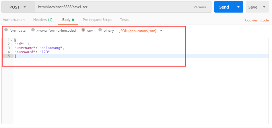 运行刚刚的项目,这里以postman测试为例子,在postman内Post请求保存方法(http://localhost:8888/saveUser),如图: