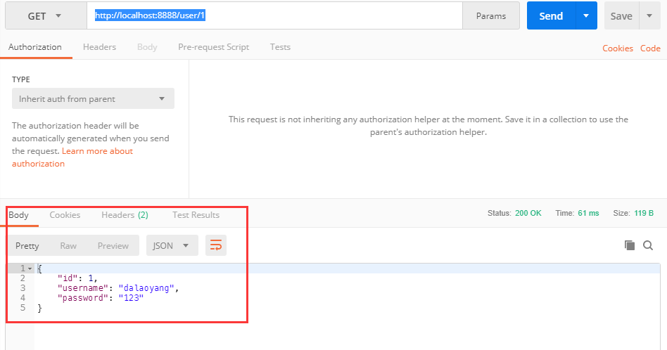 然后在请求查询用户方法(http://localhost:8888/user/1),如图所示,证明刚刚已经保存成功,下方body处为返回数据: