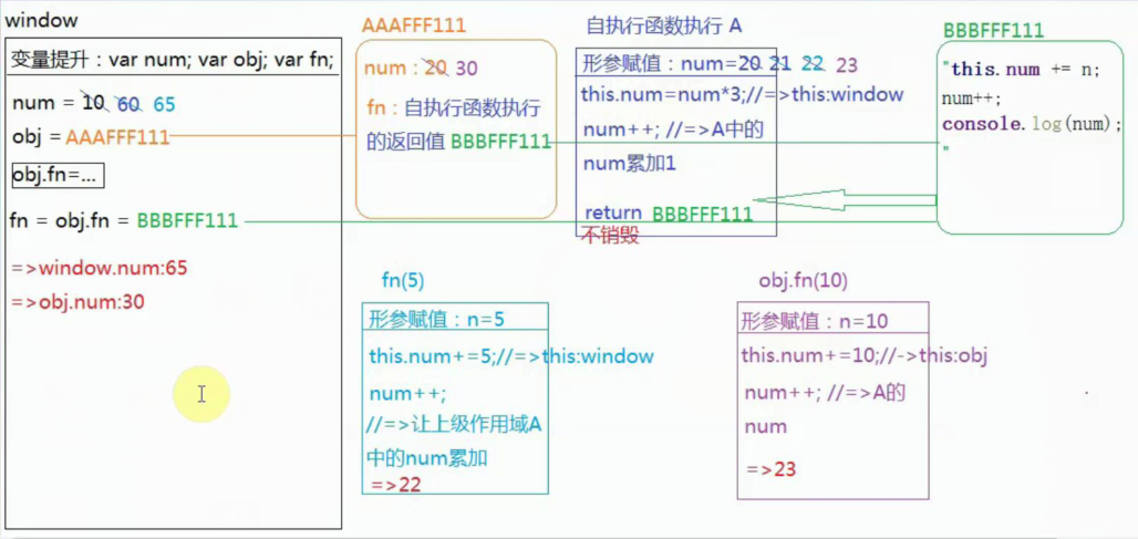 => fn()执行:形成一个私有作用域(形参赋值:无;变量提升:声明一个变量var a => 以后在函数体中出现的所有a都是私有变量), 所以函数体中输出的a是undefined,然后var a=13(私有变量赋值为13)