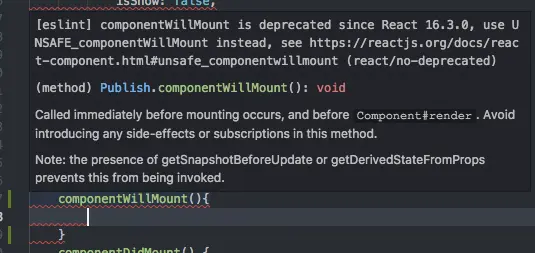 componentWillMount、componentWillReceiveProps、componentWillUpdate三个生命周期函数都有eslint报警,让我们使用UNSAFE_前缀的新的生命周期函数。不禁有疑问“react这是意欲何为啊”?为什么要加UNSAFE_前缀?
