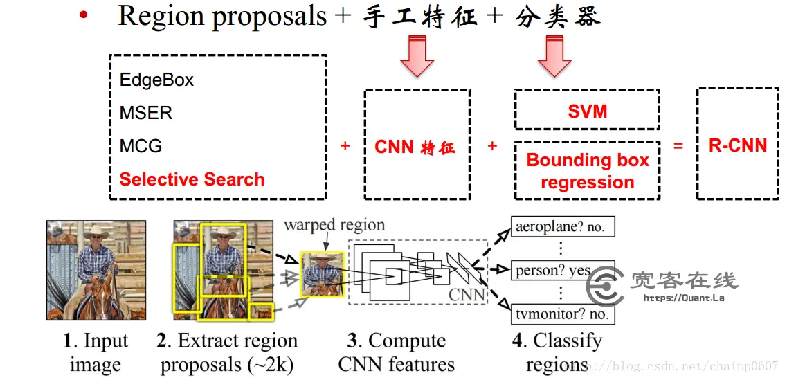 首先是区域建议(Region Proposal)算法,这个东西在CNN之前就已经有了,而且算法不止一种,ss(selective search)算法是比较著名的一个,此外还有EdgeBox,MSER,MCG等等算法。
