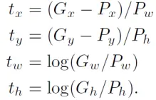而G就是经过修正后的边界框,它还是4个数Gx,Gy,Gw,Gh。通过上面的公式可以看到,t是边界框的偏差。