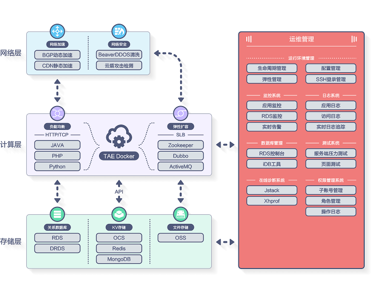同时,互联网创业团队一般规模较小、资源有限,应用的日常运维工作又耗时耗力,开发专业运维系统又成本高昂,TAE集成了运行环境管理、数据库管理、自动化监控、日志采集分析、压测系统,将开发者从运维工作中解放出来,专注业务实现。