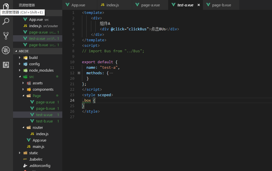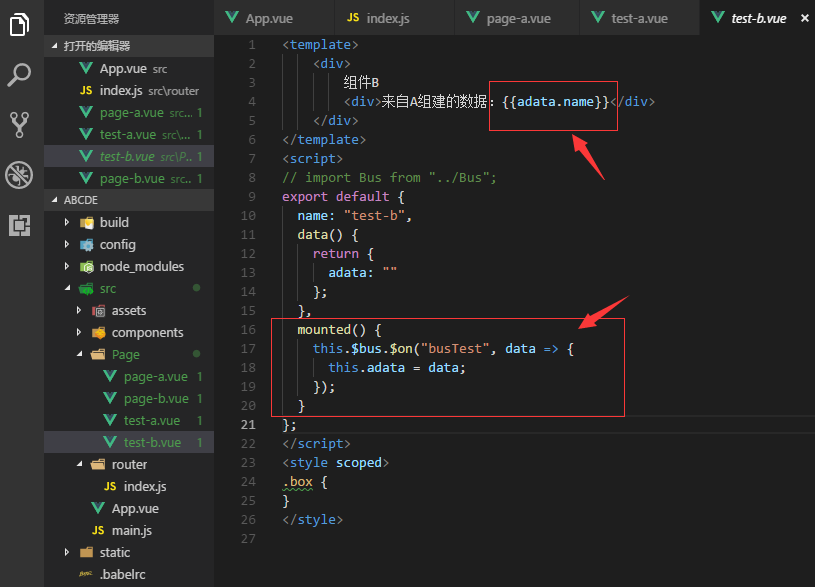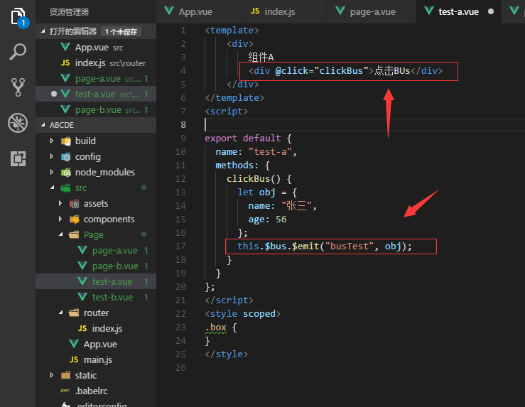 第五步:使用场景,A组件中的某个点击事件触发数据传递,所以在A组建中写上click事件,在事件中写上 this.emit("busTest", obj),其中busTest,是事件的名称,obj是要传递的数据