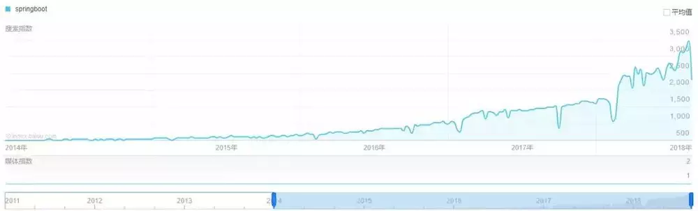 上图为 2014 年到 2018 年 Spring Boot 的百度指数,可以看出 2.0 的推出引发了搜索高峰。