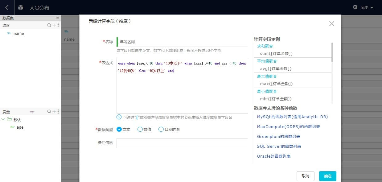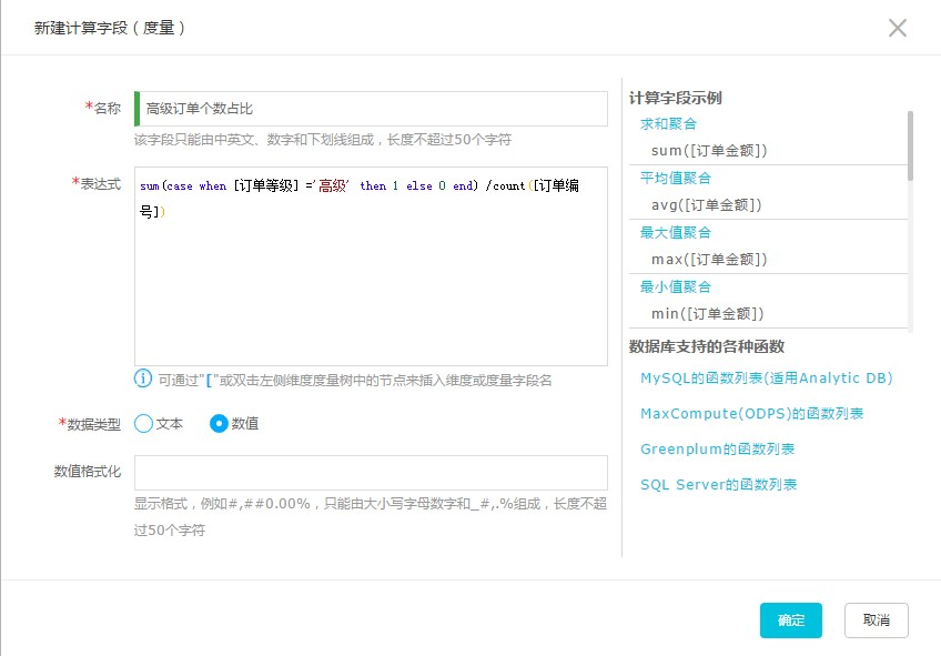 在计算字段的表达式编辑框中,当前所在数据源支持的函数和列表达式语法都可以使用。