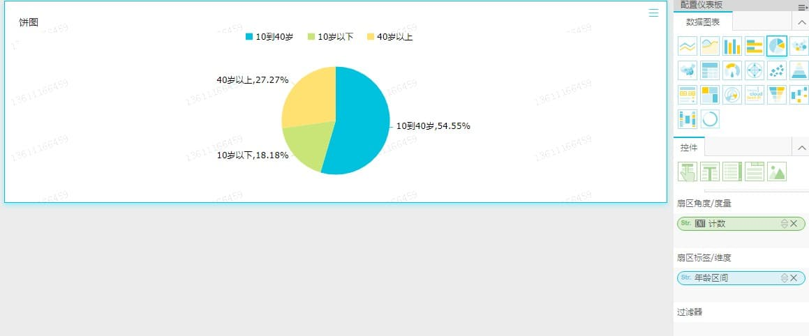 3.保存数据集,创建仪表板。添加饼图控件,添加‘年龄区间’和‘计数’字段: