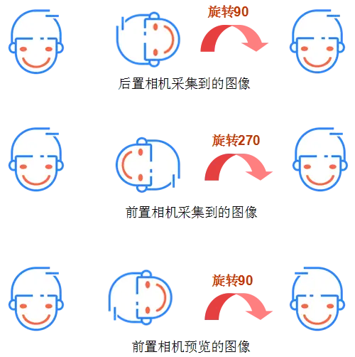对于前置摄像头,摄像头的 orientation 和屏幕方向的 orientation 两个之差即为要旋转的角度;对于后置摄像头,两者之和即为要旋转的角度。