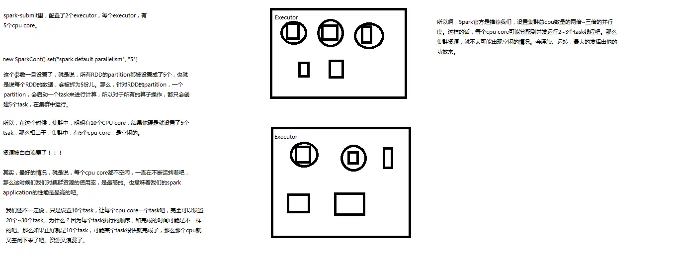 比如说,spark-submit设置了executor数量是10个,每个executor要求分配2个core,那么application总共会有20个core。此时可以设置new SparkConf().set("spark.default.parallelism", "60")来设置合理的并行度,从而充分利用资源。