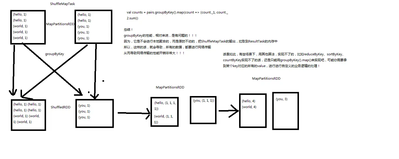 只有在reduceByKey处理不了时,才用groupByKey().map()来替代。