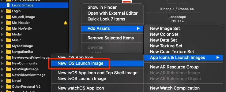需要注意的是,当你的老项目用Xcode10打开后,打开Images.xcassets文件夹,再到LaunchImage文件夹下时,找不到以上两个新机型的占位框,最简单的办法就是右键添加一个新的LaunchImage,然后删除老的LaunchImage,记得新建的文件夹要改名LaunchImage哦。