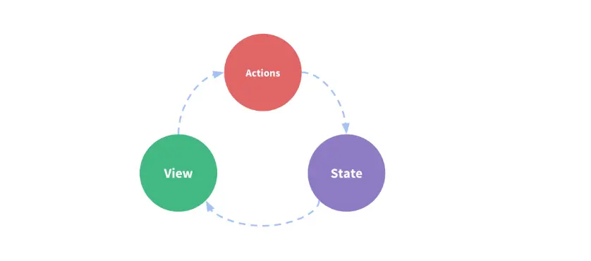 简单的来理解一下:state中放入初始数据,然乎通过action来改变state状态,view需要从state中拿数据,将其渲染到界面中,如果通过界面修改了数据,那么它是通过action去改变的state中的数据状态,然后view在state中再次取一次数据,也就是说它是一个单向数据流,下面它的任何的数据传输都离不开这个图。