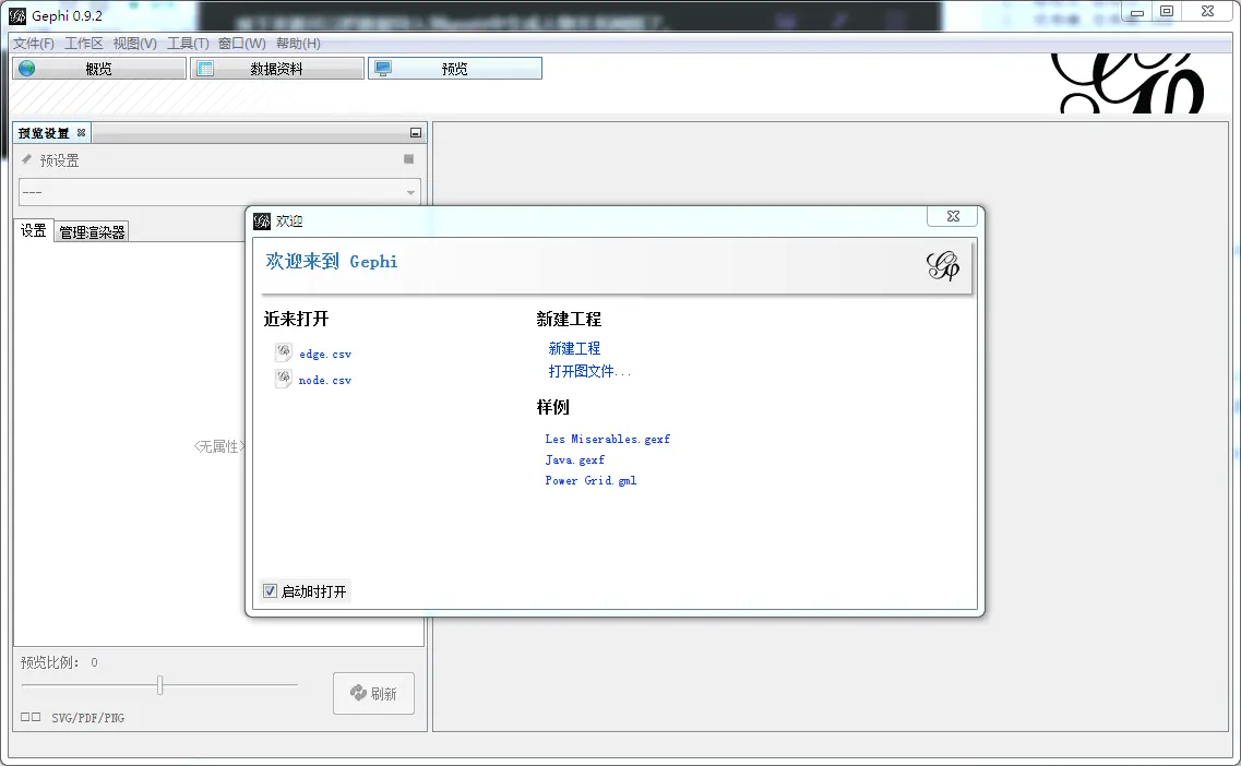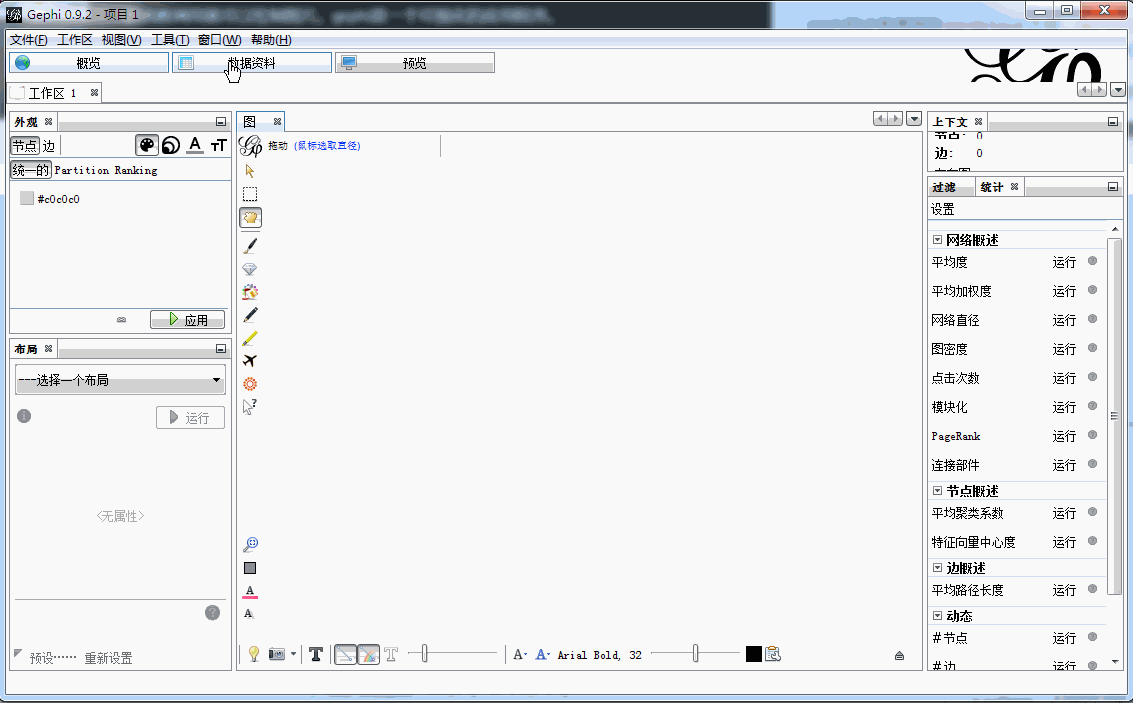 1.在https://gephi.org/ 下载windows版的安装包进行安装。打开后如下图所示。