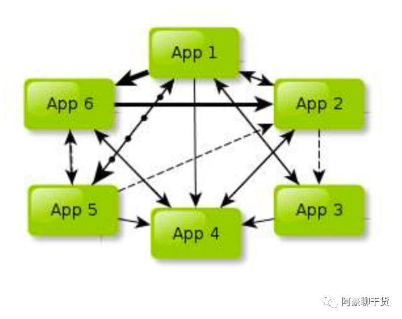 随着我们业务越来越复杂,会发现服务越来越多。SOA 架构下,它们的调用关系会变成如下形式: