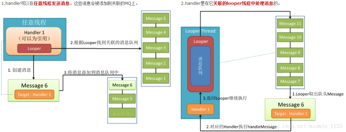 - Message中记录了负责发送和处理消息的Handler;