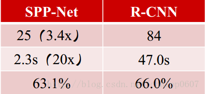 上面这张图说明了下SPP-Net与R-CNN的性能对比,其中训练时间SPP-Net需要25个小时,而R-CNN需要84小时;单张图片的测试时间SPP-Net只需要2.3s,而R-NN需要47s,这就是共享卷积计算带来的速度上的提升,也是SPP-Net最重要的贡献;最后一个指标,SPP-Net的mAP相比R-CNN反而更低了,这是因为SPP-Net的结构无法fintune卷积层。