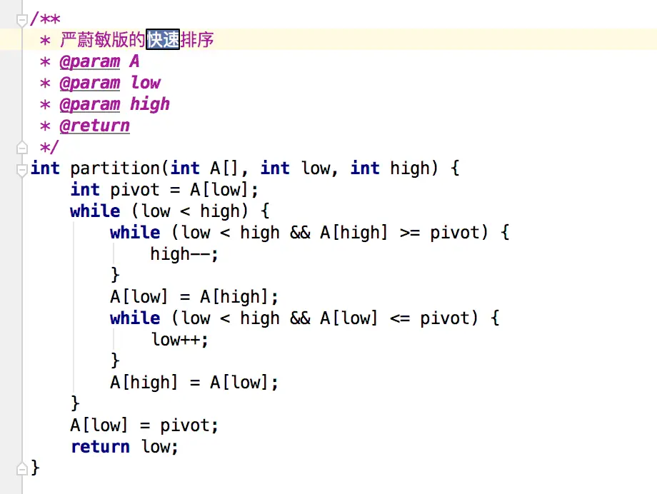 严蔚敏版快速排序: 遇到与pivot相同的元素,是不进行交换的,继续前进,无论是high指针,还是low指针