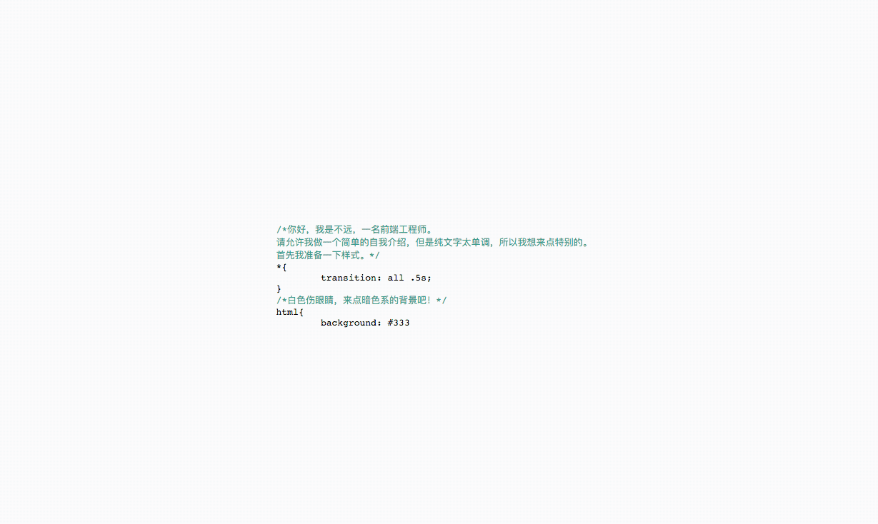 /*你好,我是不远,一名前端工程师。 请允许我做一个简单的自我介绍,但是文字太单调,所以我想来点特别的。 首先我准备一下样式。 */ *{ transition: all 1s; } html{ background:#363636 color:#fff; font-size:16px; } -