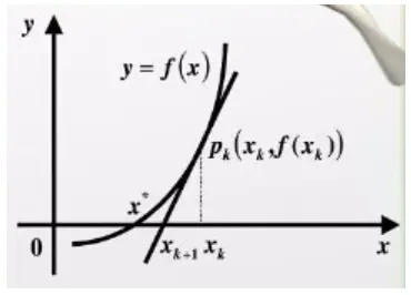 点(x[k+1], 0)满足该方程 0 = f(x[k]) + f'(x[k])(x[k+1] - x[k]) 得到牛顿迭代法的迭代公式: