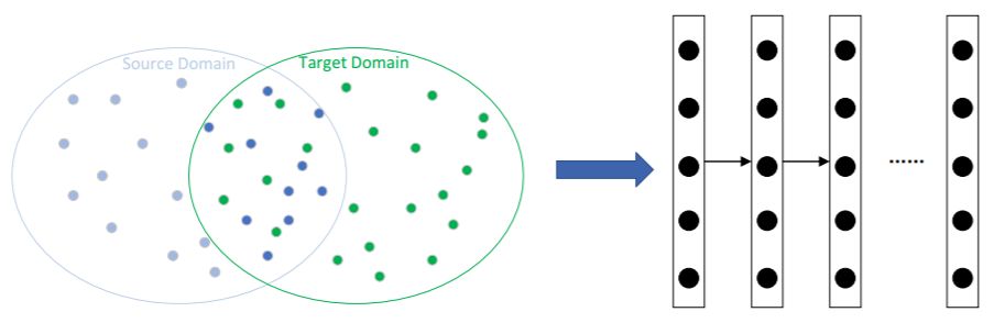 图 2:基于实例的深度迁移学习的示意图。源域中的与目标域不相似的浅蓝色实例被排除在训练数据集之外;源域中与目标域类似的深蓝色实例以适当权重包括在训练数据集中。