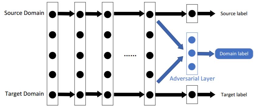 图 5:基于对抗的深度迁移学习的示意图。在源域大规模数据集的训练过程中,网络的前面层被视为特征提取器。它从两个域中提取特征并将它们输入到对抗层。