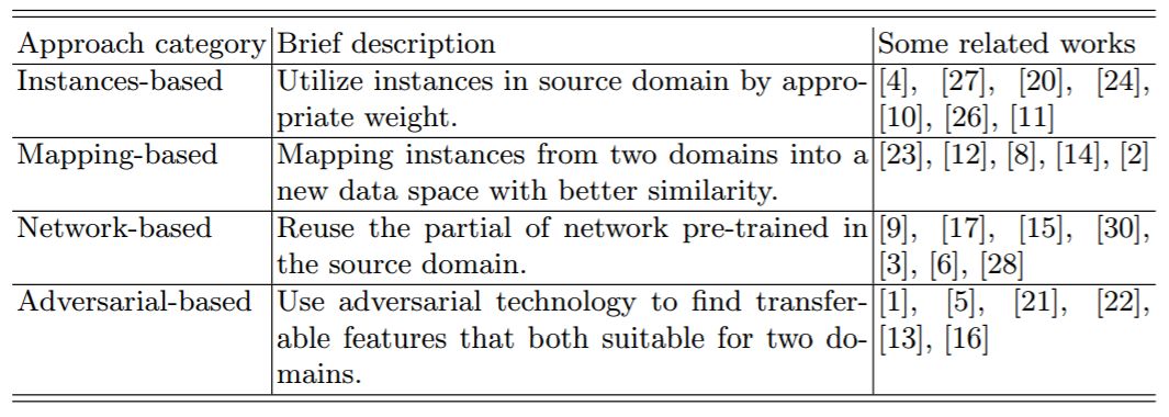综述 [19] 和 [25] 将迁移学习就源域和目标域之间的关系分为三个主要类别,这已被广泛接受。这些综述是对过去迁移学习工作的总结,它介绍了许多经典的迁移学习方法。