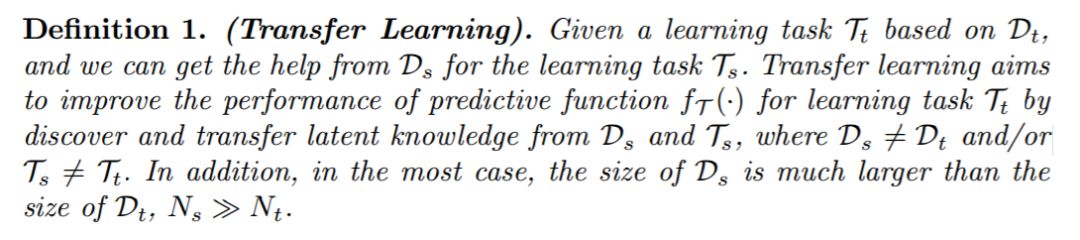 定义 1:(迁移学习)。给定一个基于数据 Dt 的学习任务 Tt,我们可以从 Ds 中获取对任务 Ts 有用的知识。迁移学习旨在通过发现并转换 Ds 和 Ts 中的隐知识来提高任务 Tt 的预测函数 fT(.) 的表现,其中 Ds ≠ Dt 且/或 Ts ≠ Tt。此外,大多数情况下,Ds 的规模远大于 Dt 的规模。