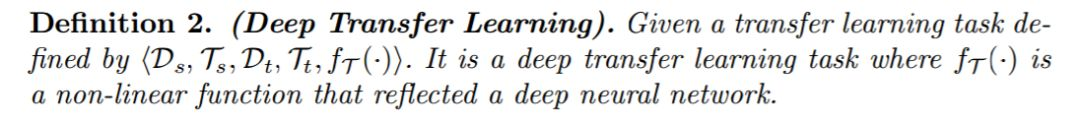 定义 2:(深度迁移学习)。给定一个由 <Ds, Ts, Dt, Tt, fT(.)>定义的迁移学习任务。这就是一个深度迁移学习任务,其中 fT(.) 是一个表示深度神经网络的非线性函数。