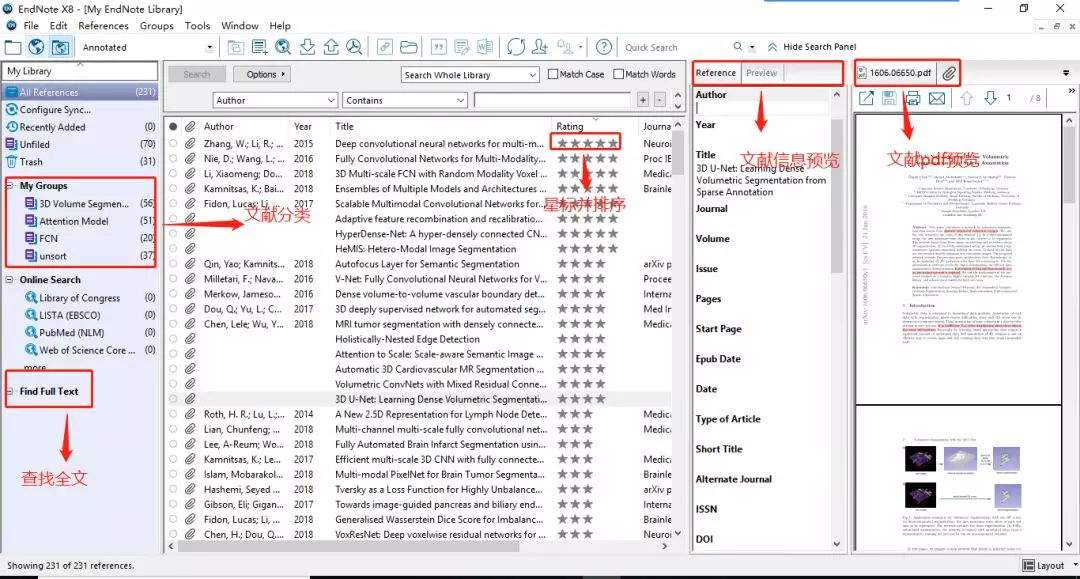 要想写出好论文,首先得有好的ideal。好的ideal在很大程度上取决于你阅读量多少高质量的论文。这时如何管理这些数量庞大的文献就成了一个棘手的问题。在这里我给大家推荐endnote文献管理软件。它支持文献的批量导入、分组、星标、笔记、pdf预览等功能。我自己的应用场景是这样的: