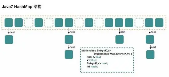 }可以看到,Entry 是一个 static class,其中包含了 key 和 value ,也就是键值对,另外还包含了一个 next 的 Entry 指针。