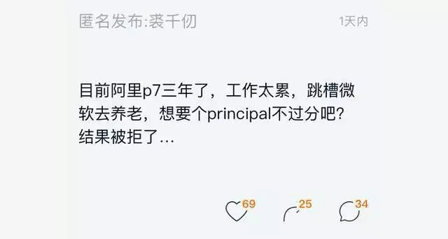 就有一位阿里工作的程序员想去微软养老。他说自己是P7级了,工作累想去微软养老,想要一个principal(微软的内部级别,类似于国内大厂的项目经理)。结果被拒了...