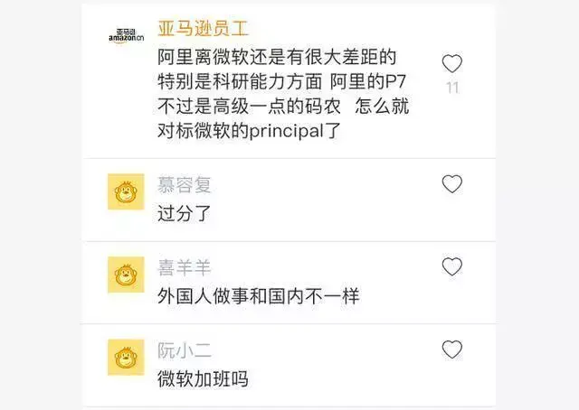 就楼主的吐槽而言,一位亚马逊工作的员工说出了自己的看法,在美国,他相信阿里巴巴对微软来说仍然有很大的差距,尤其是在科研方面,阿里的P7是不超过一个更高层次的码农而已,怎么能对标微软的principal了。事实就是如此,国内的阿里、百度却是离微软谷歌等国际性的大企业还存在差距。