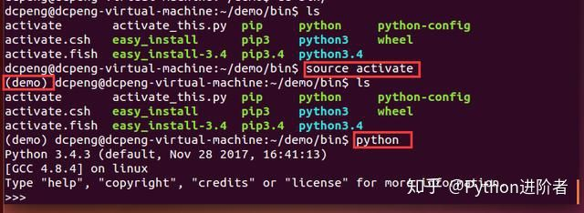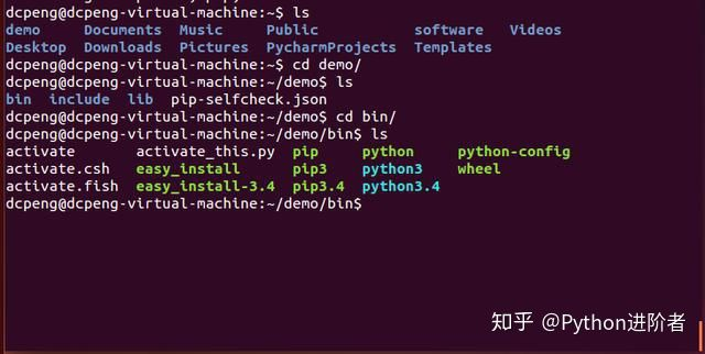 4、进入虚拟环境demo,然后进入到bin目录下,里边的文件与Windows下的虚拟环境不太一致,激活虚拟环境的方法也不一致,如下图所示。