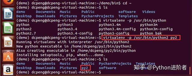 6、如果想要创建Python2的虚拟环境,则需要回到想要创建虚拟环境的文件夹下,并输入命令“virtualenv –p /usr/bin/python2 py2”,其中py2是虚拟环境的名字,如下图所示。