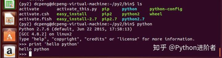 8、此时在py2虚拟环境中输入python,可以看到系统会自动的切换到Python2环境,如下图所示。