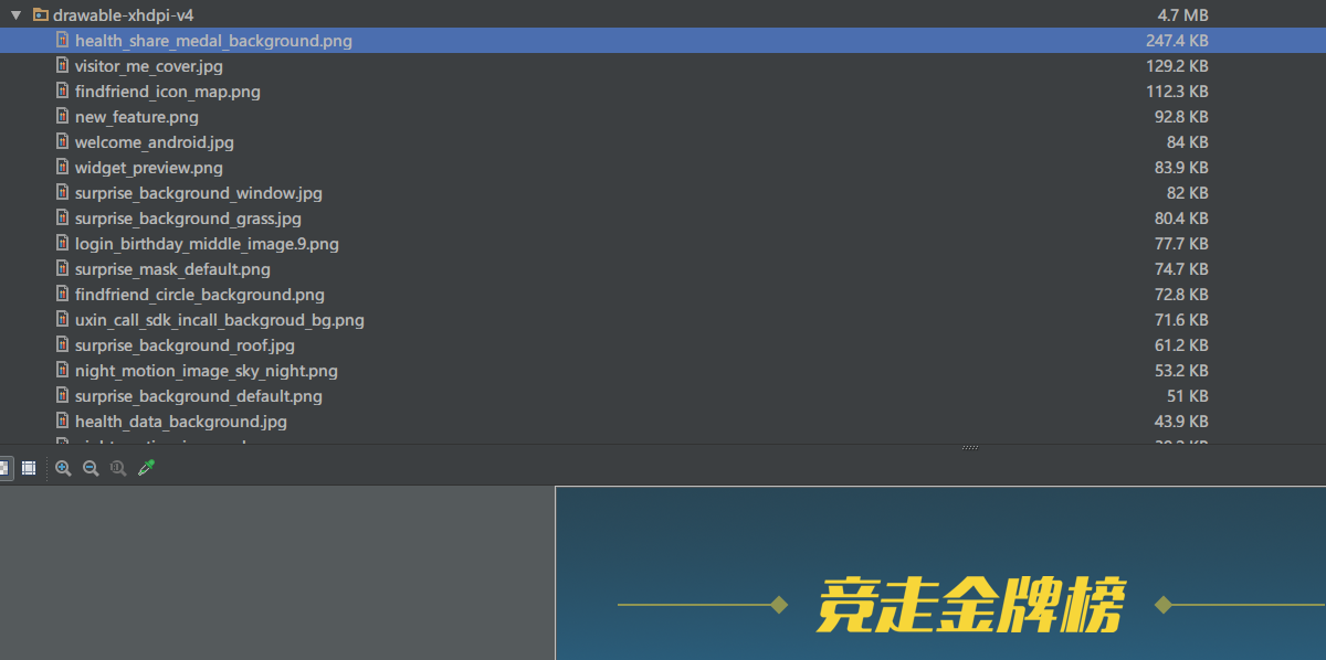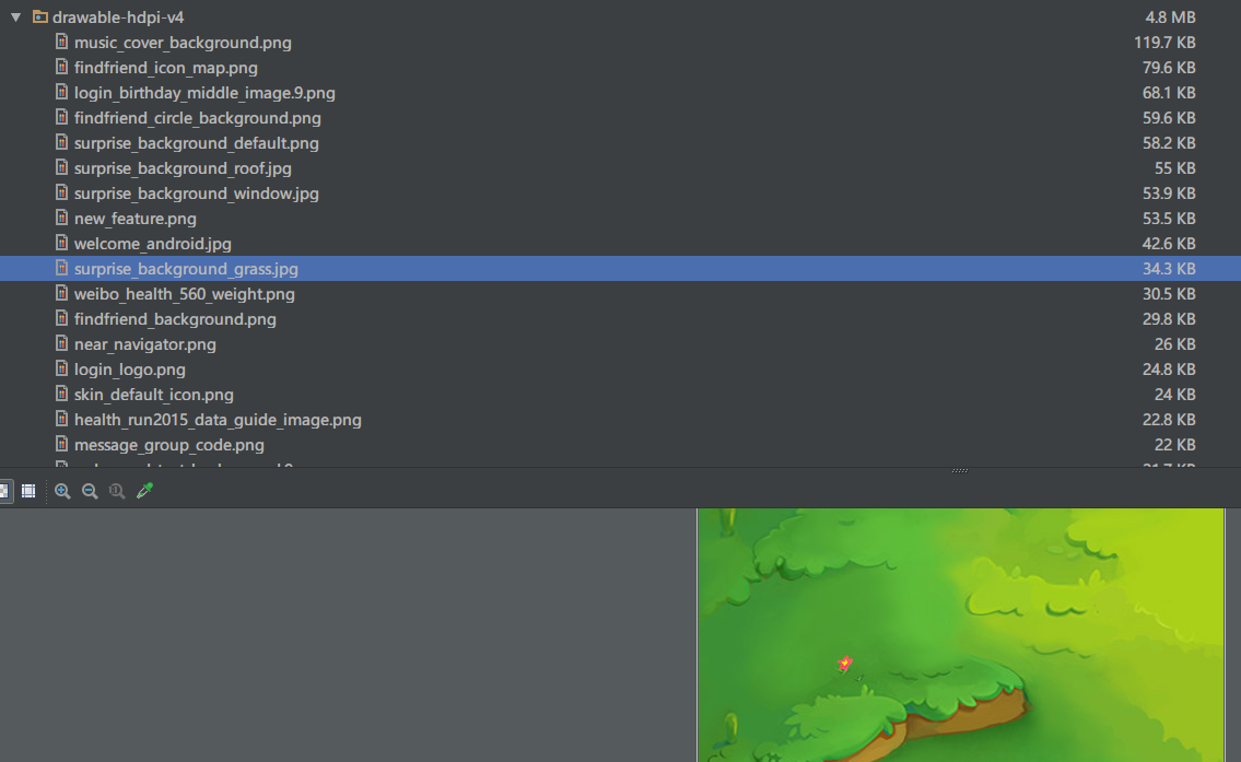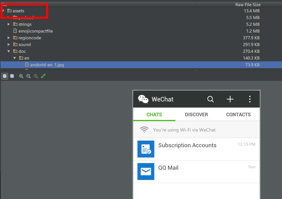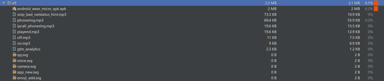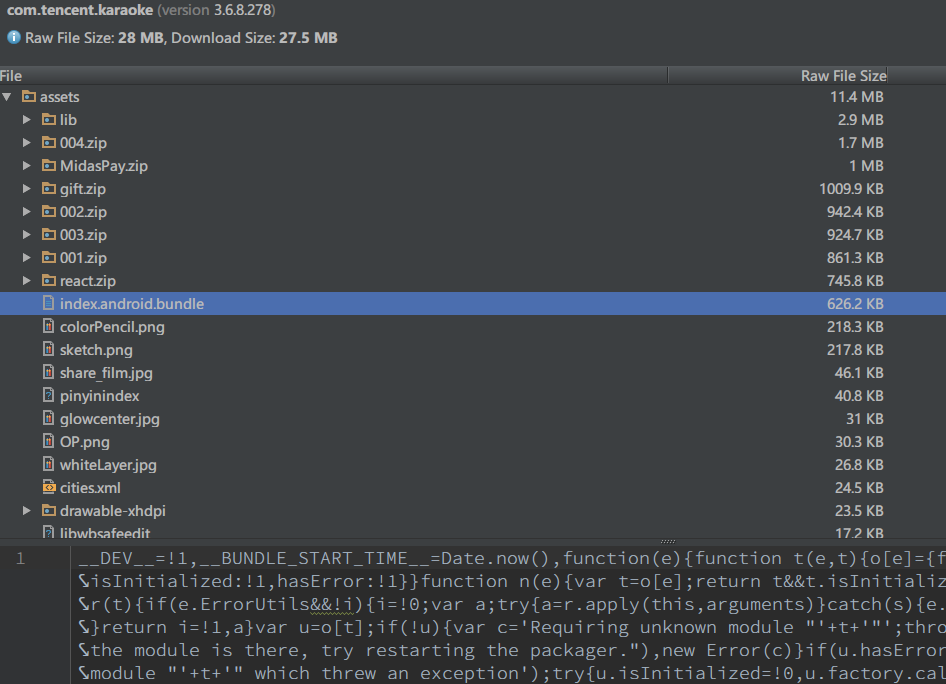 assets中会存放资源文件,这个目录中各个app存放的内容都有所不同,所以优化也比较难。自从引入RN以来,这个目录下还会有jsbundle的信息。如果你有地址选择的功能,这里还会存放地址的映射文件(可参考全名k歌)。对于这块的资源,as是不会进行主动的删减的,所以一切都是需要靠开发者进行手动管理的。