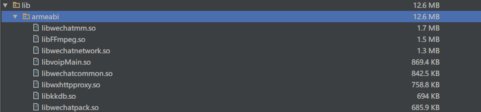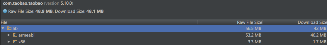 lib目录下会有各种so文件,分析器会检查出项目自己的so和各种库的so。微博和微信一样只支持了arm一个平台,淘宝支持了arm和x86两个平台。