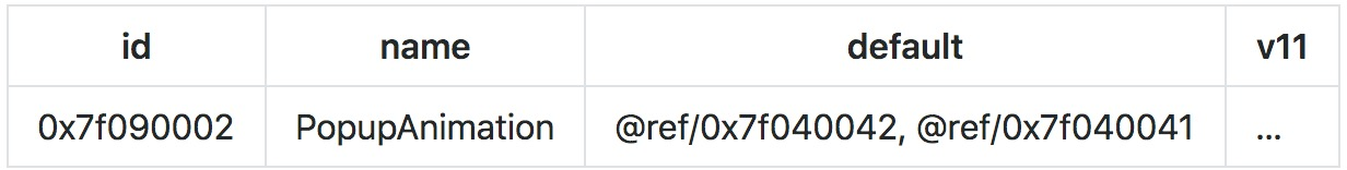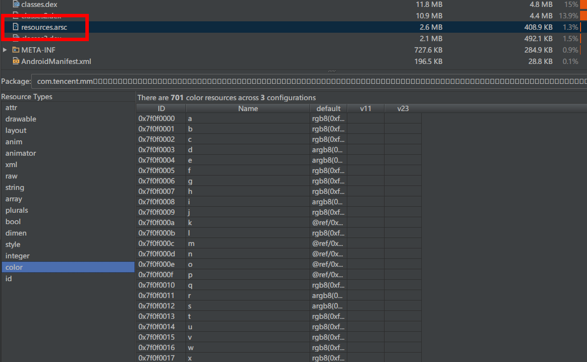 这个文件是编译后的二进制资源文件,里面是id-name-value的一个map。因为微信做了资源的混淆,所以这里可以看到资源名称都是不可读的。