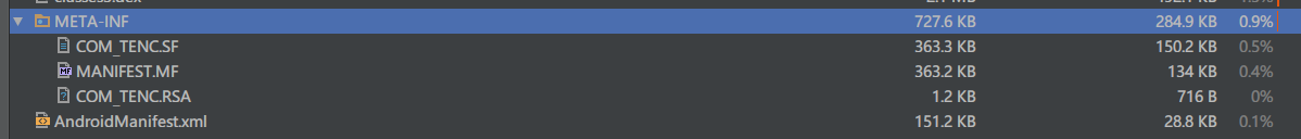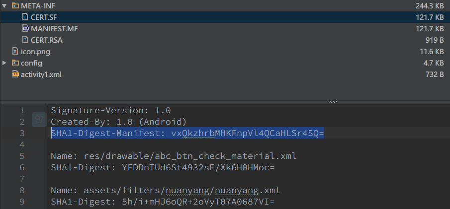 META-INF目录下存放的是签名信息,用来保证apk包的完整性和系统的安全性,帮助用户避免安装来历不明的盗版apk。