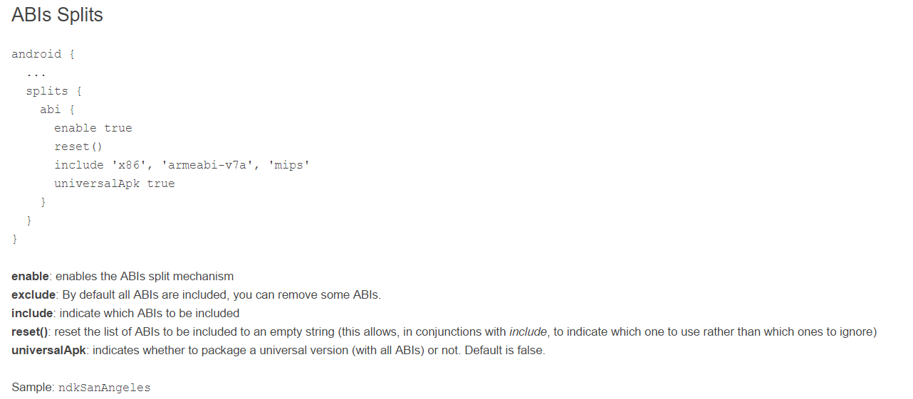 一个硬件设备对应一个架构(mips、arm或者x86),只保留与设备架构相关的库文件夹(主流的架构都是arm的,mips属于小众,默认也是支持arm的so的,但x86的不支持)可以大大降低lib文件夹的大小。配置方式也十分简单,直接配置abiFilters即可: