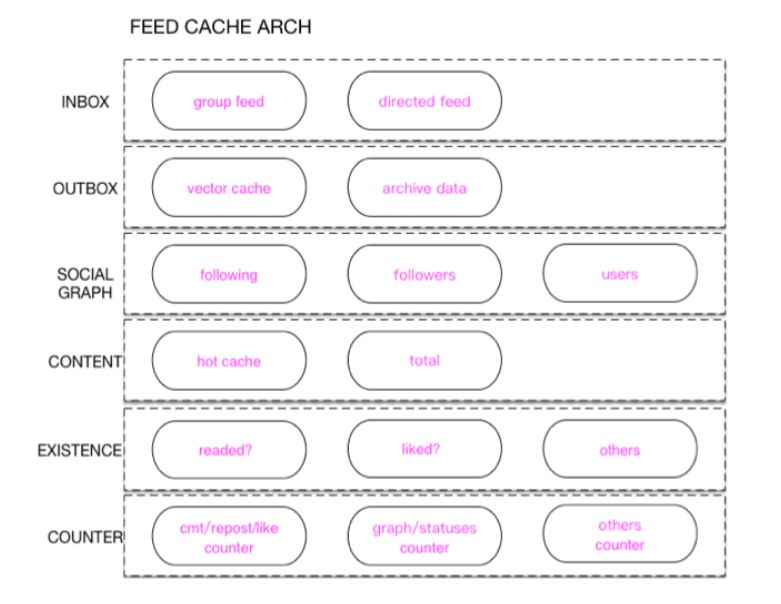 第二层是 Outbox, 每个用户都会发常规的微博,都会到它的 Outbox 里面去。根据存的 ID 数量,实际上分成多个 Cache,普通的大概是 200 多条,如果长的大概是 2000 条。