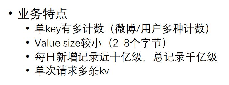 但在微博里计数出现了一些特点: 单条 Key 有多条计数,比如一条微博,有转发数、评论数,还有点赞;一个用户有粉丝数、关注数等各种各样的数字。