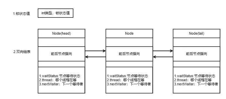 lock的存储结构:一个int类型状态值(用于锁的状态变更),一个双向链表(用于存储等待中的线程)