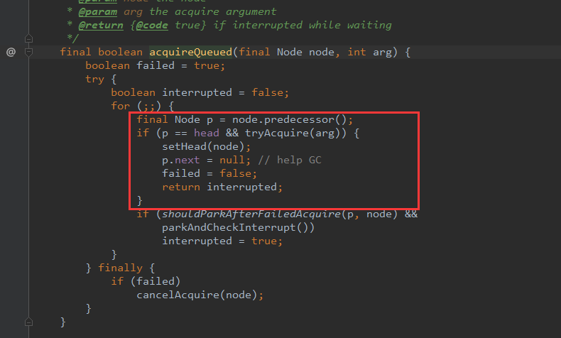 acquireQueued:通过自旋,判断当前队列节点是否可以获取锁。
