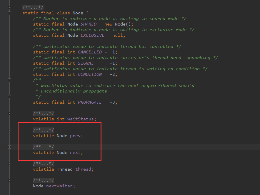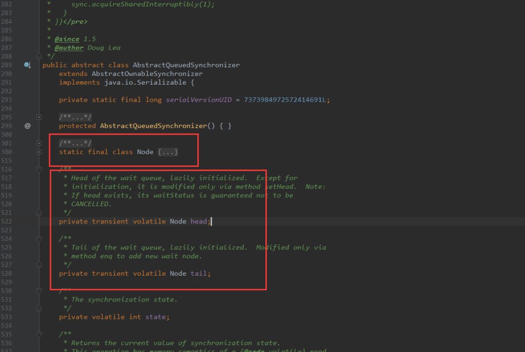 最后我们可以发现锁的存储结构就两个东西:"双向链表" + "int类型状态"。需要注意的是,他们的变量都被" transient和volatile修饰。