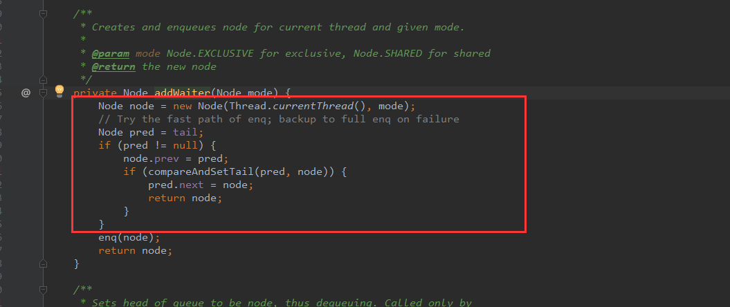 可以看到,通过CAS确保能够在线程安全的情况下,将当前线程加入到链表的尾部。 enq是个自旋+上述逻辑,有兴趣的可以翻翻源码。