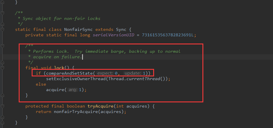 FairSync 与 NonfairSync的区别在于,是不是保证获取锁的公平性,因为默认是NonfairSync,我们以这个为例了解其背后的原理。
